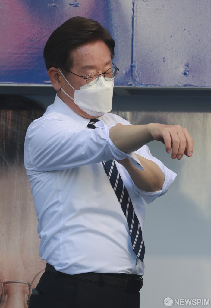 [부산=뉴스핌] 이형석 기자 = 이재명 더불어민주당 대선후보가 27일 오후 부산 부산진구 중앙대로에서 열린 ‘부산을 위해, 나를 위해 이재명아이가!’ 집중유세에서 연설을 준비하고 있다. 2022.02.27 leehs@newspim.com