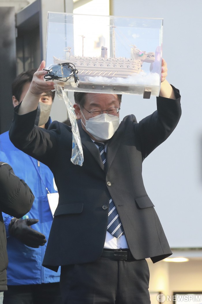 [부산=뉴스핌] 이형석 기자 = 이재명 더불어민주당 대선후보가 27일 오후 부산 부산진구 중앙대로에서 열린 ‘부산을 위해, 나를 위해 이재명아이가!’ 집중유세에서 거북선을 선물받고 있다. 2022.02.27 leehs@newspim.com