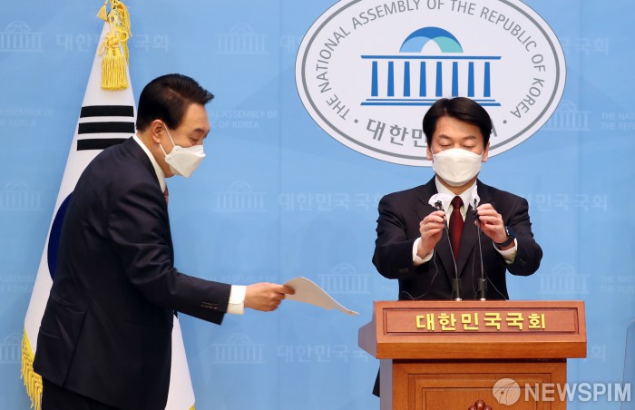 [서울=뉴스핌] 이형석 기자 = 야권 단일화에 전격 합의한 윤석열 국민의힘 대선 후보와 안철수 국민의당 대선 후보가 3일 오전 서울 여의도 국회 소통관에서 공동 기자회견을 준비하고 있다. 2022.03.03 leehs@newspim.com