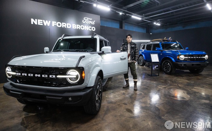[서울=뉴스핌] 윤창빈 기자 = 포드코리아가 3일 오전 서울 성동구 에스팩토리에서 뉴 포드 브롱코를 공개하고 있다. 브롱코는 지난 1996년 생산이 중단된 후 25년만에 생산이 재개된 모델이다. 강력한 퍼포먼스와 스마트한 주행능력, 트렌디한 디자인을 모두 갖춘 뉴 포드 브롱코는 온로드와 오프로드 모두에서 안정적인 주행 능력을 갖춘 4도어 하드탑 아우터뱅크스 모델로 출시된다. 뉴 포드 브롱코의 국내 판매 가격은 부가세 포함 6,900만원(3.5% 개별소비세 적용 시) 이다. 2022.03.03 pangbin@newspim.com