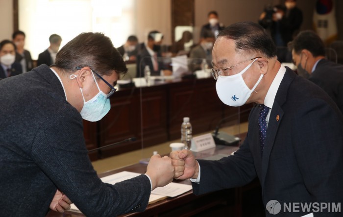 [서울=뉴스핌] 김학선 기자 = 홍남기 부총리 겸 기획재정부 장관이 3일 서울 종로구 정부서울청사에서 열린 소재·부품·장비 경쟁력강화위원회에서 참석자들과 인사하고 있다. 2022.03.03 yooksa@newspim.com