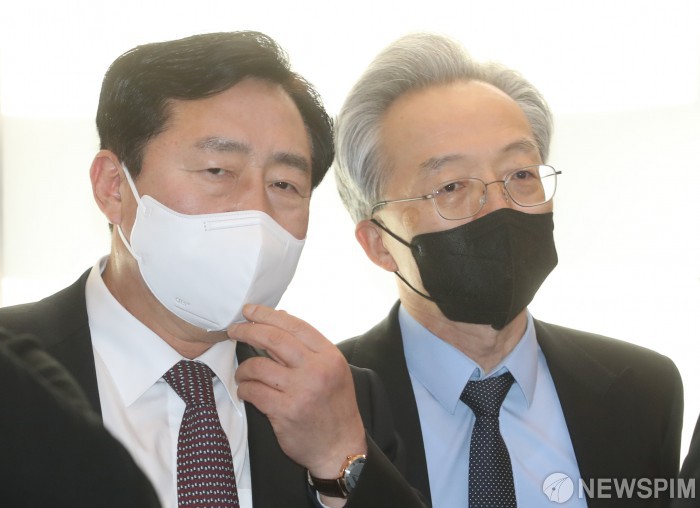 [서울=뉴스핌] 김학선 기자 = 김기문 중소기업중앙회장(왼쪽)과 최진식 한국중견기업연합회장이 3일 서울 종로구 정부서울청사에서 열린 소재·부품·장비 경쟁력강화위원회에 참석해 대화를 나누고 있다. 2022.03.03 yooksa@newspim.com