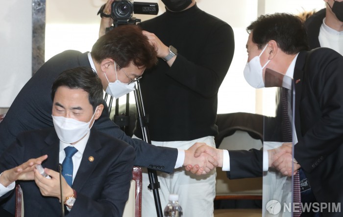 [서울=뉴스핌] 김학선 기자 = 권칠승 중소벤처기업부 장관(왼쪽)과 김기문 중소기업중앙회장이 3일 서울 종로구 정부서울청사에서 열린 소재·부품·장비 경쟁력강화위원회에 참석해 인사를 나누고 있다. 2022.03.03 yooksa@newspim.com