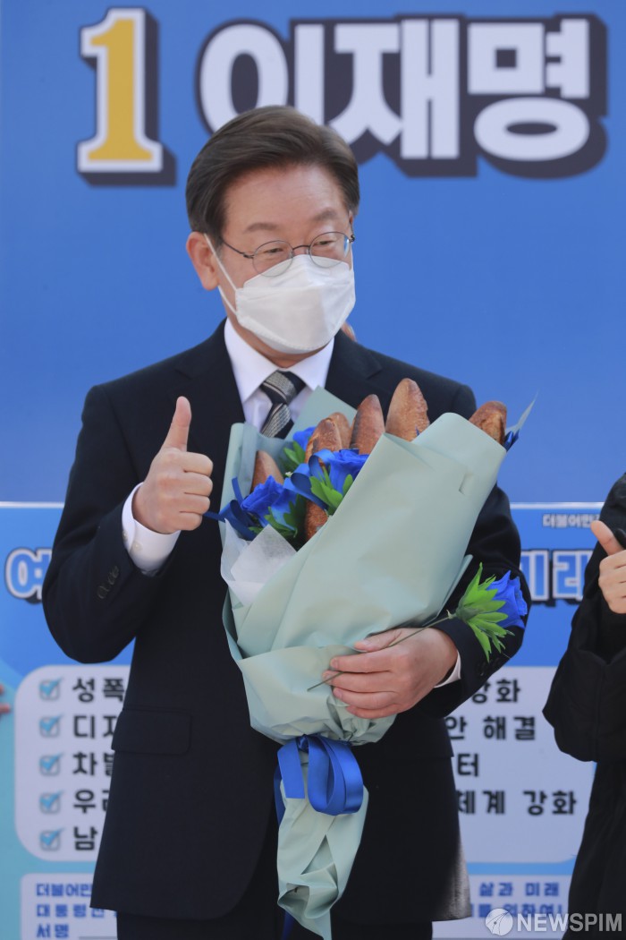 [서울=뉴스핌] 이형석 기자 = 이재명 더불어민주당 대선후보가 3일 오후 서울 종로 보신각터에서 열린 ‘우리 모두를 위해, 성평등 사회로’ 유세에서 세계 여성의 날을 의미하는 빵과 장미를 들고 유권자를 향해 지지를 호소하고 있다. 2022.03.03 leehs@newspim.com