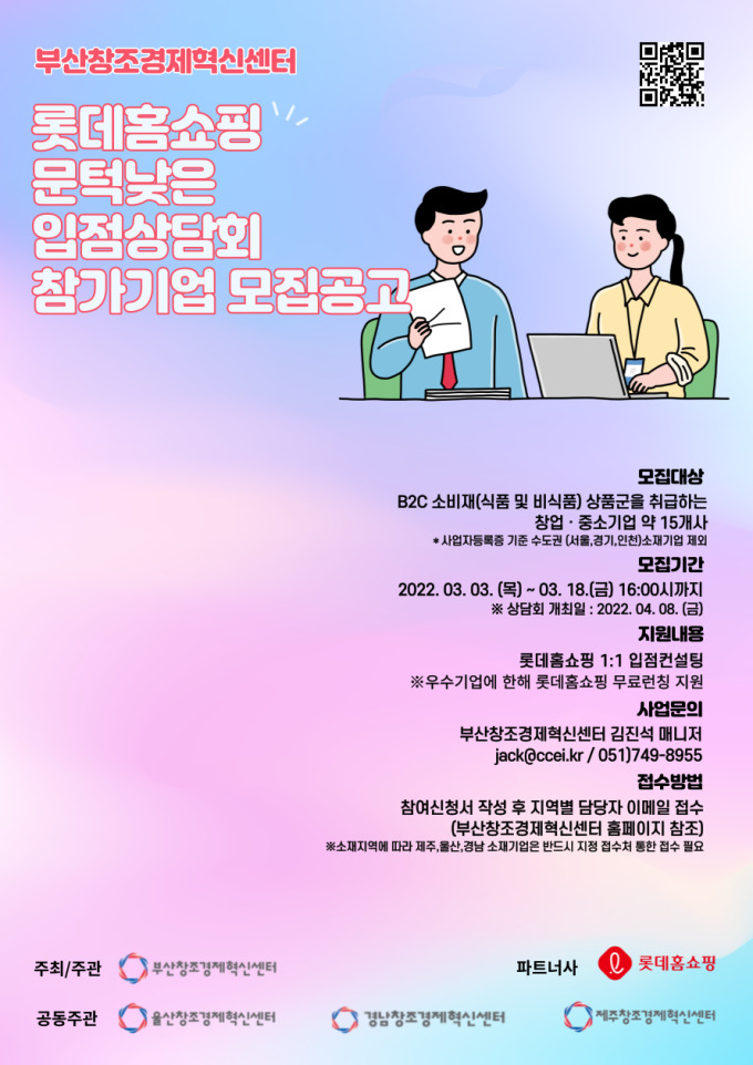 문턱 낮은 입점 상담회는 롯데홈쇼핑 MD와의 1:1 입점 컨설팅을 제공하는 프로그램으로, 올해는 부산·울산·경남·제주 창조경제혁신센터와 함께 지역 기업 중심으로 모집한다.