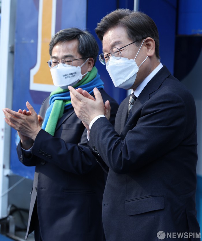[서울=뉴스핌] 국회사진취재단 = 이재명 더불어민주당 대선 후보가 3일 서울 영등포구 타임스퀘어 앞 광장에서 열린 '영등포를 일등포로, 이재명은 합니다!' 영등포 집중 유세에서 지원유세에 나선 김동연 후보와 함께 박수를 치고 있다. 2022.03.03 photo@newspim.com