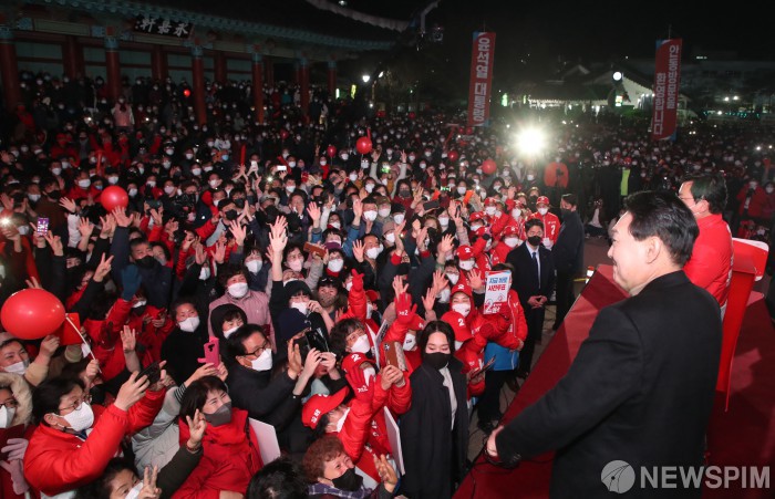 [안동=뉴스핌] 최상수 기자 = 윤석열 국민의힘 대선후보가 4일 경북 안동시 웅부공원에서 열린 "혁신유림의 고장 안동의 선택이 대한민국을 혁신합니다" 안동 유세에서 지지자들의 환호에 손을 들어 답례하고 있다. 2022.03.04 kilroy023@newspim.com