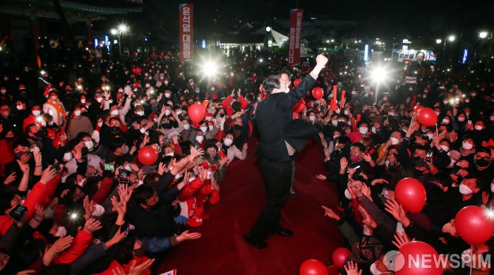 [안동=뉴스핌] 최상수 기자 = 윤석열 국민의힘 대선후보가 4일 경북 안동시 웅부공원에서 열린 "혁신유림의 고장 안동의 선택이 대한민국을 혁신합니다" 안동 유세에서 지지자들의 환호에 손을 들어 답례하고 있다. 2022.03.04 kilroy023@newspim.com