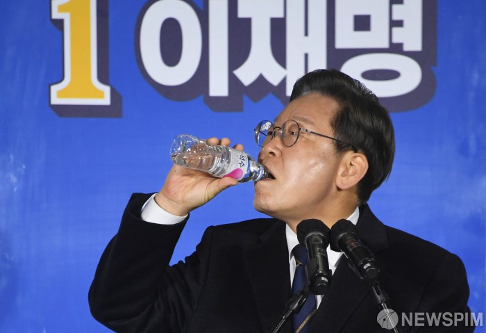 [서울=뉴스핌] 국회사진취재단 = 이재명 더불어민주당 대선 후보가 4일 서울 강동구 강동아트센터 입구에서 열린 유세에서 연설을 마친 후 물을 마시고 있다. 2022.03.04 photo@newspim.com