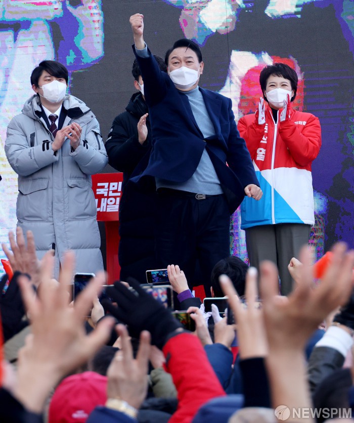 [광주=뉴스핌] 최상수 기자 = 윤석열 국민의힘 대선후보가 5일 오후 경기도 광주 경안시장 앞에서 열린 유세에서 환호하는 지지자를 향해 어퍼컷 세리머니를 하고 있다. 2022.03.05 kilroy023@newspim.com