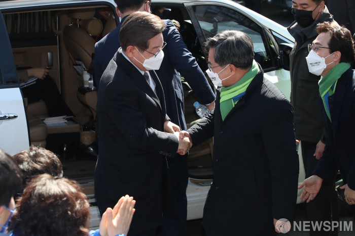 [서울=뉴스핌] 국회사진취재단 = 이재명 더불어민주당 대선 후보가 6일 오후 서울 도봉구 도봉산 입구에서 열린 ‘사통팔달 도봉, 서울의 신경제중심지! 이재명은 합니다!’ 도봉 집중유세에 참석하며 김동연 새로운물결 대표와 인사를 나누고 있다. 2022.03.06 photo@newspim.com