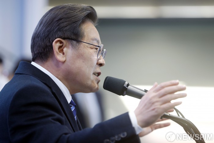[청주=뉴스핌] 이형석 기자 = 이재명 더불어민주당 대선 후보가 7일 충북 청주 상당구에서 '대한민국의 심장 충북, 이재명과 다시 뜁시다!' 유세를 열고 지지를 호소하고 있다. 2022.03.07 leehs@newspim.com