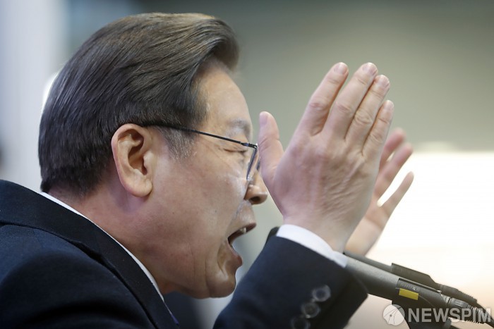 [청주=뉴스핌] 이형석 기자 = 이재명 더불어민주당 대선 후보가 7일 충북 청주 상당구에서 '대한민국의 심장 충북, 이재명과 다시 뜁시다!' 유세를 열고 지지를 호소하고 있다. 2022.03.07 leehs@newspim.com