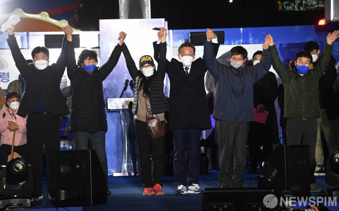 [서울=뉴스핌] 국회사진취재단 = 이재명 더불어민주당 대선 후보가 8일 서울 청계광장에서 열린 집중유세에서 초등학교 동창들과 함께 지지자에게 손을 들어 인사하고 있다. 2022.03.08 photo@newspim.com
