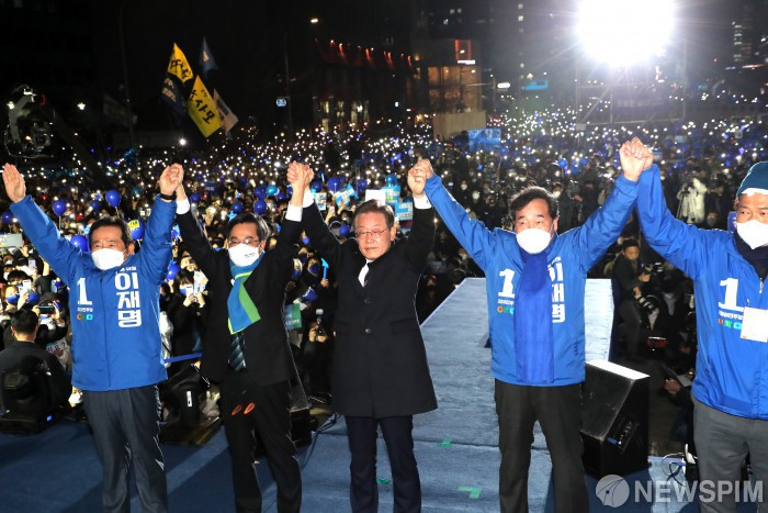 [서울=뉴스핌] 국회사진취재단 = 이재명 더불어민주당 대선후보가 8일 오후 서울 중구 청계광장에서 열린 마지막 유세에서 송영길 대표, 이낙연 총괄선대위원장 등과 손을 맞잡고 지지자들을 향해 인사하고 있다. 2022.03.08 photo@newspim.com