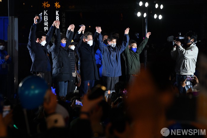 [서울=뉴스핌] 국회사진취재단 = 이재명 더불어민주당 대선 후보가 8일 오후 서울 중구 청계광장에서 열린 '국민의 꿈이 이재명의 꿈입니다' 서울 집중 유세에서 초등학교 동창들과 기념촬영을 하고 있다. 2022.03.08 photo@newspim.com