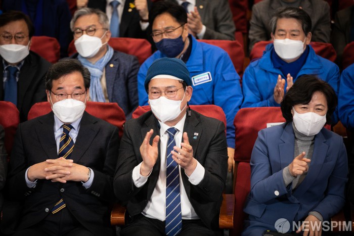[서울=뉴스핌] 이형석 기자 = 제20대 대통령선거일인 9일 저녁 서울 여의도 의원회관에 마련된 더불어민주당 개표 상황실에서 송영길 대표와 이낙연 총괄선대위원장, 추미애 전 장관 등 당 관계자들이 방송사 출구조사 결과를 지켜보고 있다. 2022.03.09 leehs@newspim.com