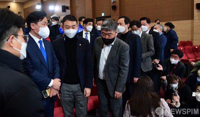 [서울=뉴스핌] 이형석 기자 = 윤석열 국민의힘 대선 후보가 20대 대통령 선거 개표 결과 당선이 유력한 10일 새벽 서울 여의도 국회 의원회관 더불어민주당 개표 상황실에서 의원들이 침통한 표정으로 상황실을 나서고 있다. 2022.03.10 leehs@newspim.com