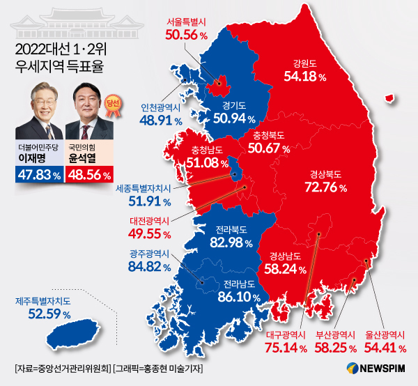 [그래픽] 2022대선 1·2위 우세지역 득표율