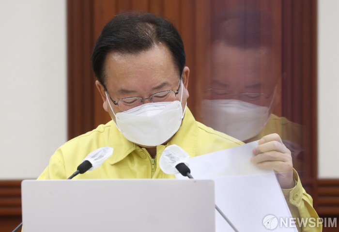 [서울=뉴스핌] 김학선 기자 = 김부겸 국무총리가 11일 서울 종로구 정부서울청사에서 열린 코로나19 대응 중앙재난안전대책본부 회의에서 자료를 정리하고 있다. 2022.03.11 yooksa@newspim.com