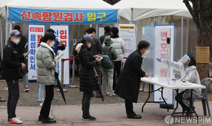 [서울=뉴스핌] 황준선 기자 = 코로나19의 신규 확진자가 30만790명이 발생한 14일 오전 서울 여의도공원에 마련된 임시선별검사소에서 시민들이 코로나19 검사를 기다리고 있다. 2022.03.14 hwang@newspim.com