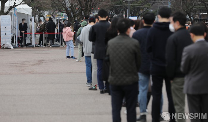 [서울=뉴스핌] 황준선 기자 = 코로나19의 신규 확진자가 30만790명이 발생한 14일 오전 서울 여의도공원에 마련된 임시선별검사소에서 시민들이 코로나19 검사를 기다리고 있다. 2022.03.14 hwang@newspim.com