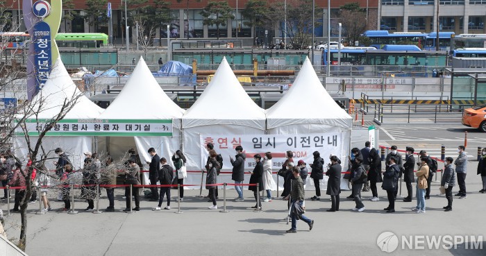 [서울=뉴스핌] 김민지 기자 = 코로나19 신규 확진자가 역대 최다인 36만 2338명 발생한 15일 오후 서울 중구 서울역 임시선별검사소에서 시민들이 줄 서 있다. 이날 사망자는 293명 발생했다. 2022.03.15 kimkim@newspim.com