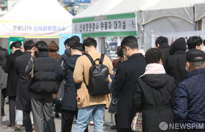 [서울=뉴스핌] 김민지 기자 = 코로나19 신규 확진자가 역대 최다인 36만 2338명 발생한 15일 오후 서울 중구 서울역 임시선별검사소에서 시민들이 줄 서 있다. 이날 사망자는 293명 발생했다. 2022.03.15 kimkim@newspim.com