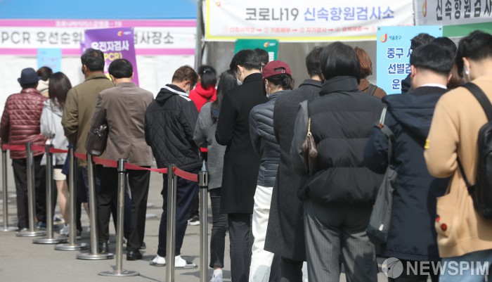 [서울=뉴스핌] 김민지 기자 = 코로나19 신규 확진자가 역대 최다인 36만 2338명 발생한 15일 오후 서울 중구 서울역 임시선별검사소에서 시민들이 줄 서 있다. 이날 사망자는 293명 발생했다. 2022.03.15 kimkim@newspim.com