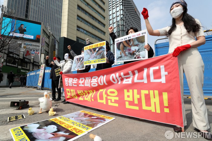 [서울=뉴스핌] 정일구 기자 = 한국동물보호연합 관계자들이 15일 오후 서울 종로구 광화문광장 앞에서 산채로 털을 뽑는 다운(Down) 반대 퍼포먼스 기자회견을 열고 구호를 외치고 있다. 2022.03.15 mironj19@newspim.com