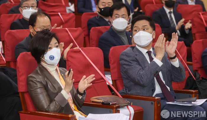 [서울=뉴스핌] 최상수 기자 = 김기현 국민의힘 원내대표(오른쪽)가 16일 서울 여의도 국회의원회관에서 열린 '제20대 대선 불공정방송 100일간의 기록, 공영언론 어떻게 바뀌어야 하나' 토론회에서 박수를 치고 있다. 왼쪽은 황보승희 의원. 2022.03.16 kilroy023@newspim.com
