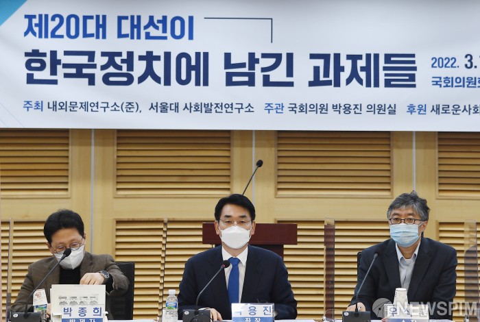[서울=뉴스핌] 최상수 기자 = 더불어민주당 박용진 의원실 주최로 16일 서울 여의도 국회에서 열린 ‘제20대 대선이 한국정치에 남긴 과제들’ 토론회에서 박 의원(가운데)이 인사말을 하고 있다. 2022.03.16 kilroy023@newspim.com