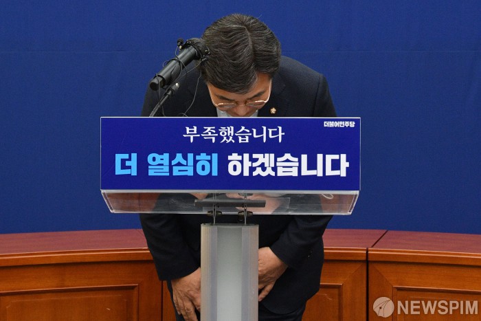 [서울=뉴스핌] 이형석 기자 = 윤호중 더불어민주당 공동비상대책위원장이 20일 오후 서울 여의도 국회에서 기자간담회를 열고 비대위 운영과 당 쇄신 방안 등을 발표한 후 인사하고 있다. 2022.03.20 leehs@newspim.com