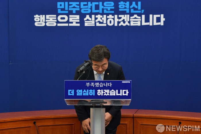 [서울=뉴스핌] 이형석 기자 = 윤호중 더불어민주당 공동비상대책위원장이 20일 오후 서울 여의도 국회에서 기자간담회를 열고 비대위 운영과 당 쇄신 방안 등을 발표한 후 인사하고 있다. 2022.03.20 leehs@newspim.com