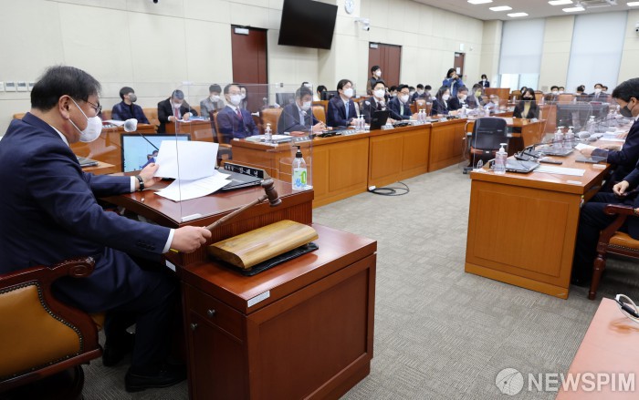 [서울=뉴스핌] 이형석 기자 = 김태년 정개특위 위원장이 24일 국회에서 열린 정치개혁특별위원회 전체회의에서 의사봉을 두드리고 있다. 2022.03.24 leehs@newspim.com