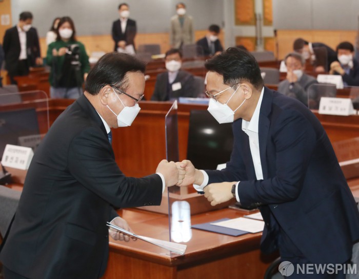 [서울=뉴스핌] 김학선 기자 = 김부겸 국무총리가 28일 오후 서울 종로구 정부서울청사 별관에서 열린 제28차 4차산업혁명위원회 전체회의에서 윤성로 4차산업혁명위원장과 인사를 나누고 있다. 2022.03.28 yooksa@newspim.com