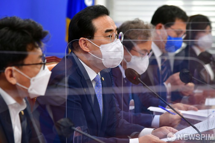 [서울=뉴스핌] 이형석 기자 = 박홍근 더불어민주당 원내대표가 29일 서울 여의도 국회에서 열린 원내대책회의에서 모두발언을 하고 있다. 2022.03.29 leehs@newspim.com