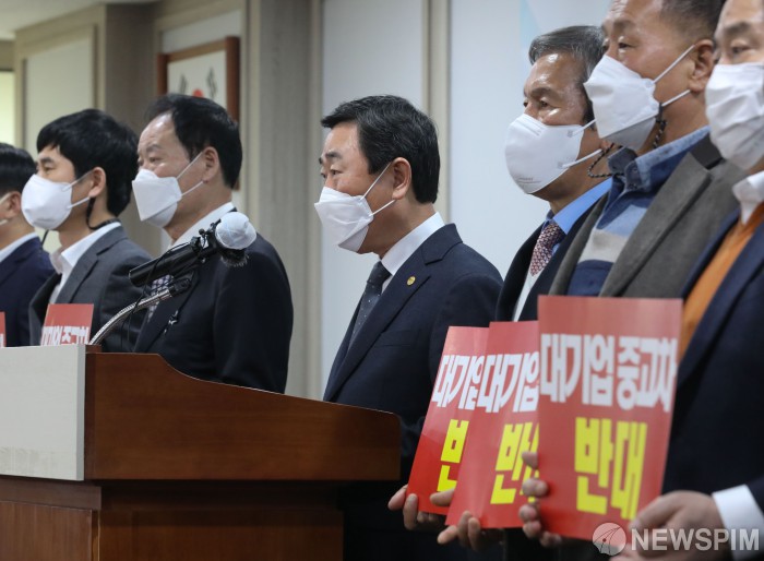[서울=뉴스핌] 황준선 기자 = 장남해 전국자동차매매사업조합연합회 회장과 조합원들이 29일 오후 서울 여의도 중소기업중앙회에서 현대·기아차의 매매업 진출 반대 기자회견을 하고 있다. 2022.03.29 hwang@newspim.com