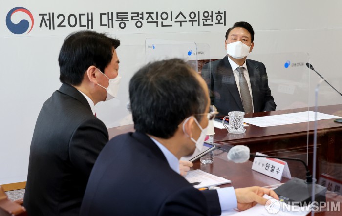 [서울=뉴스핌] 인수위사진기자단 = 윤석열 대통령 당선인이 31일 오전 서울 종로구 통의동 대통령직인수위원회에서 열린 경제 1·2분과, 과학기술교육분과 업무보고 회의에 참석해 안철수 인수위원장의 모두발언을 경청하고 있다. 2022.03.31 photo@newspim.com