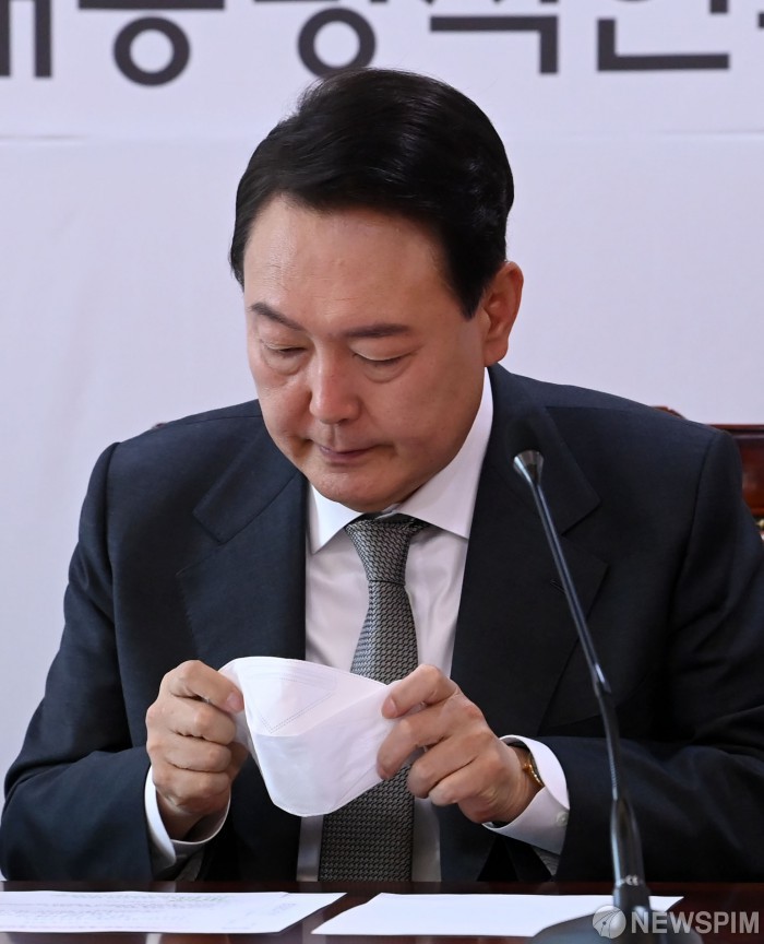 [서울=뉴스핌] 인수위사진기자단 = 윤석열 대통령 당선인이 31일 오전 서울 종로구 통의동 대통령직인수위원회에서 열린 경제1분과 업무보고 회의에서 마스크를 고쳐 쓰고 있다. 2022.03.31 photo@newspim.com