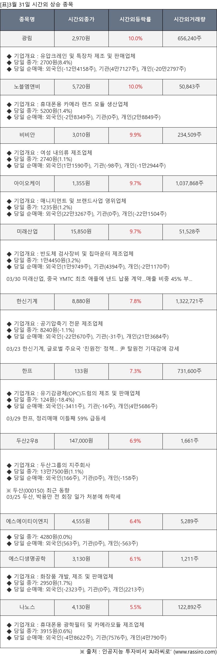 ※ 관련 종목: 광림, 노블엠앤비, 비비안, 아이오케이, 미래산업, 한신기계, 한프, 두산2우B, 에스에이티이엔지, 에스디생명공학, 나노스