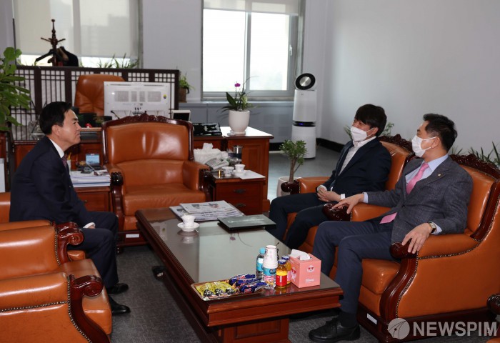 [서울=뉴스핌] 이형석 기자 = 이준석 국민의힘 대표(가운데)와 김기현 원내대표가 4일 여의도 국회 농림축산식품해양수산위원장실에서 김태흠 의원(왼쪽)과 만나고 있다. 2022.04.04 leehs@newspim.com