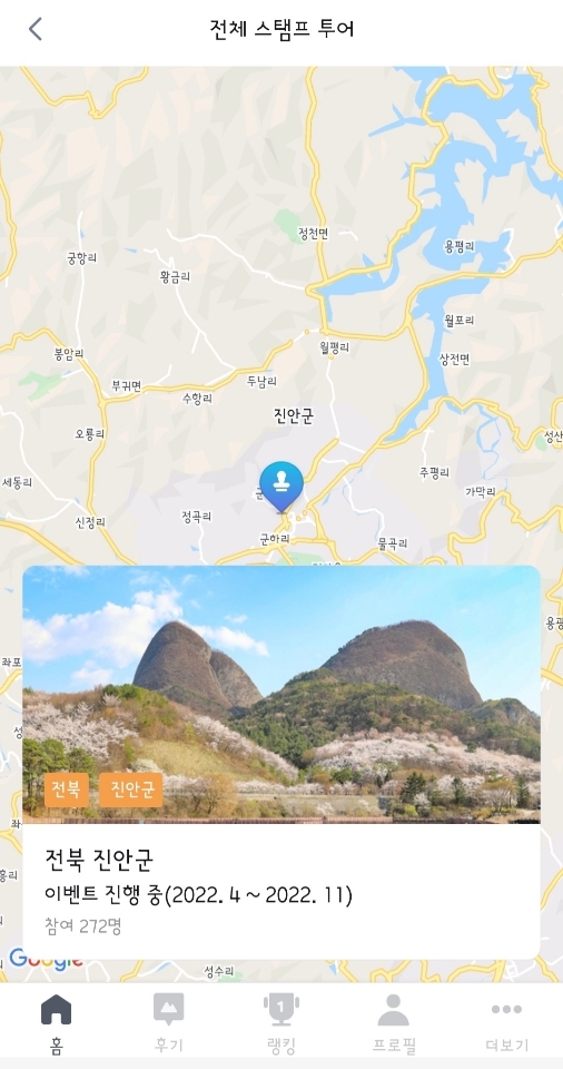 참여방법은 구글 플레이스토어 또는 애플 앱스토어에서 '스탬프투어'앱 설치 및 로그인 후 진안군 스탬프투어를 선택한 후 현재 위치에서 가까운 장소의 스탬프존으로 접근해 스탬프를 인증하면 된다.