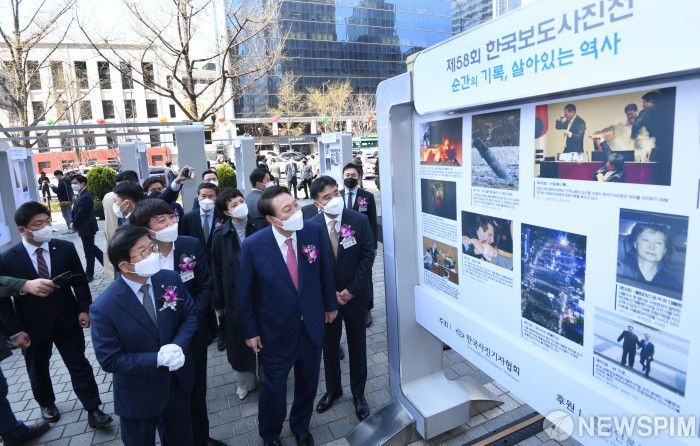 [서울=뉴스핌] 인수위사진기자단 = 윤석열 대통령 당선인이 4일 오전 서울 중구 프레스센터광장에서 열린 제58회 한국보도사진전 ‘순간의 기록, 살아있는 역사’ 개막식에 참석해 박병석 국회의장, 이준석 국민의힘 당대표, 이호재 한국사진기자협회 회장 등과 수상작을 감상하고 있다. 2022.04.04 photo@newspim.com