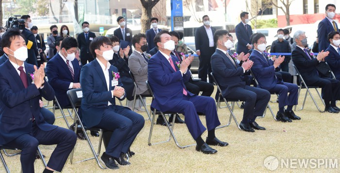 [서울=뉴스핌] 인수위사진기자단 = 4일 오전 서울 중구 프레스센터광장에서 열린 제58회 한국보도사진전 ‘순간의 기록, 살아있는 역사’ 개막식에서 (왼쪽부터) 오세훈 서울시장, 이준석 국민의힘 당대표, 윤석열 대통령 당선인, 이호재 한국사진기자협회 회장, 박병석 국회의장 등이 박수를 치고 있다. 2022.04.04 photo@newspim.com