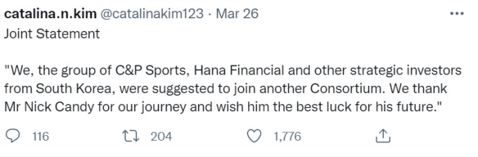 지난달 26일 김나나 C&P스포츠 대표는 자신의 트위터를 통해 "하나금투와 한국의 또 다른 전략적 투자자(SI)가 다른 컨소시엄으로부터 합류 제안을 받았다"며 하나금투의 다른 컨소시엄 참여 가능성을 시사했다. 특히 하나금투 외에 또 다른 국내 금융사도 제안받은 것으로 알려졌다.