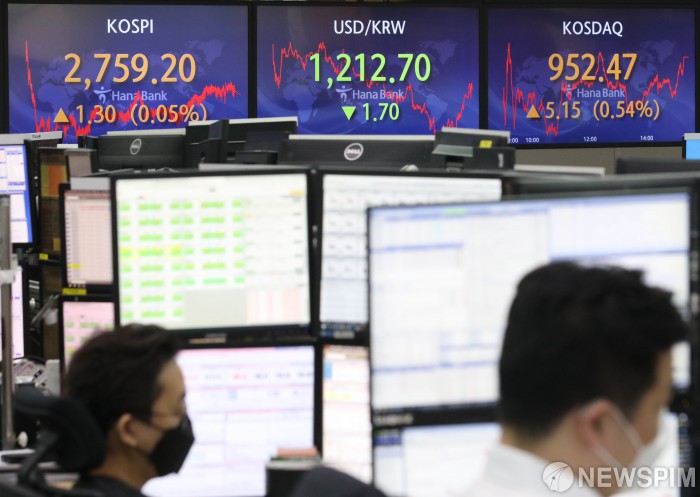 [서울=뉴스핌] 황준선 기자 = 5일 코스피는 전 거래일(2757.90)보다 1.30포인트(0.05%) 오른 2759.20에 거래를 마쳤다. 코스닥지수는 전 거래일(947.32)보다 5.15포인트(0.54%) 상승한 952.47에 마감했다. 원·달러 환율은 전 거래일(1214.4원)보다 1.7원 내린 1212.7원에 문을 닫았다. 이날 오후 서울 중구 하나은행 딜링룸 전광판에 지수가 표시돼 있다. 2022.04.05 hwang@newspim.com