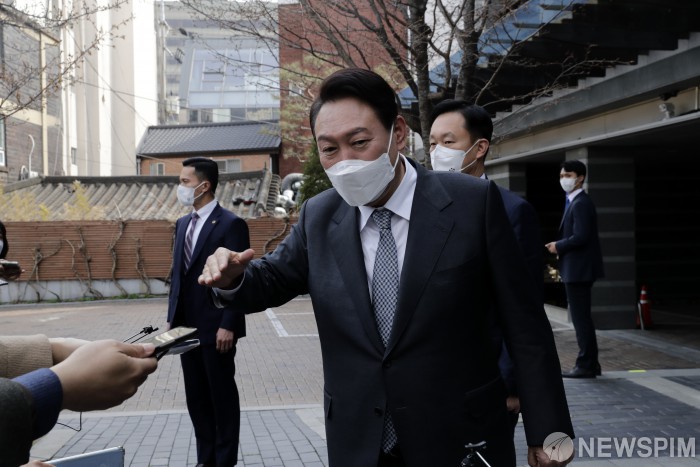 [서울=뉴스핌] 인수위사진기자단 = 윤석열 대통령 당선자가 5일 오후 서울 종로구 통의동 금융감독원 연수원에 마련된 대통령직인수위원회에 들어오면서 기자들의 질문에 답변하고 있다. 2022.04.05 photo@newspim.com