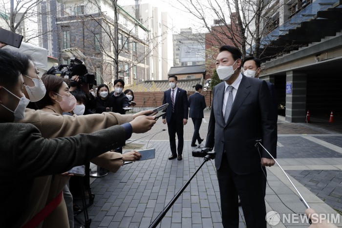 [서울=뉴스핌] 인수위사진기자단 = 윤석열 대통령 당선자가 5일 오후 서울 종로구 통의동 금융감독원 연수원에 마련된 대통령직인수위원회에 들어오면서 기자들의 질문에 답변하고 있다. 2022.04.05 photo@newspim.com