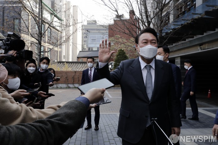 [서울=뉴스핌] 인수위사진기자단 = 윤석열 대통령 당선자가 5일 오후 서울 종로구 통의동 금융감독원 연수원에 마련된 대통령직인수위원회에 들어오면서 기자들의 질문에 답변하고 있다. 2022.04.05 photo@newspim.com